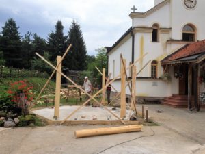 SJENICA KOD CRKVE U SASINI, 11. VII. 2019. Naš župnik vel. Adolf i s. Miroslava počeli su podizati sjenicu dok sam bio u Sasini. U subotu 13. srpnja 2019. postavljeni su stupovi nosači montazne nadstrešnice. Biti će nam lijepo kada dođemo u Sasinu